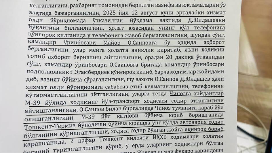 Тошкент шаҳар Йўл ҳаракати хавфсизлиги бошқармаси 4-батальон 5-сафарбарлик гуруҳи командири Муҳиддин Улашов Чиноз прокурори ёрдамчисининг саволига жавоб берар экан, 2025 йил 12 август куни эрталабки хизмат олди йўриқномада ўтказилган йўқламада Даврон Йўлдошев иштирок этмагани, телефон қилса жавоб бермагани, кўп ўтмай подполковник Ғ.Эгамбердиев уларга қўнғироқ қилиб, Чинозда ЙПХ инспектори иштирокида авария содир бўлди, дея айтганини сўзлаб берган.