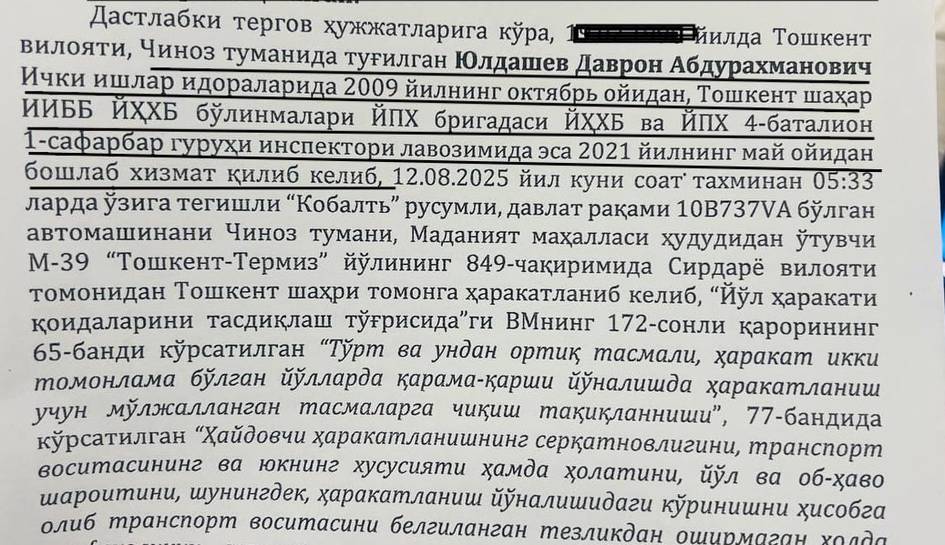 Рақамсиз автомобильда ҳаракатланиб келган ЙПХ инспектори (гувоҳлар ЙПХ инспектор автомобильи ўша куни рақамсиз бўлганини тасдиқлаган — таҳририят изоҳи) Даврон Йўлдошев тергов давомида йўл ҳаракати қоидаларини бузганини тан олган. Ҳаттоки, ЙПХ инспекторининг формада ўша куни ишга шошиб кетаётганини тергов давомида унинг бошлиғи — Муҳиддин Улашов ҳам тасдиқлаган.