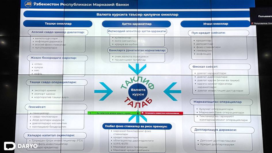 Shu bilan birga, hukumat va Markaziy bank moliyaviy operatsiyalari, Tiklanish va taraqqiyot jamgʻarmasi pul oʻtkazmalari ham kursga taʼsir qilishi bildirildi.
